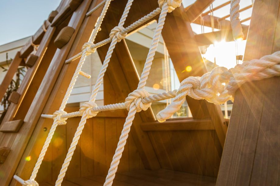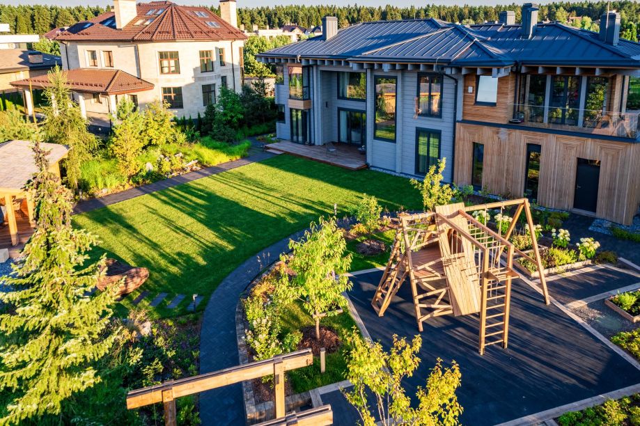 Детская игровая площадка на участке в загородном доме. Фотосессия для портфолио компании-производителя.